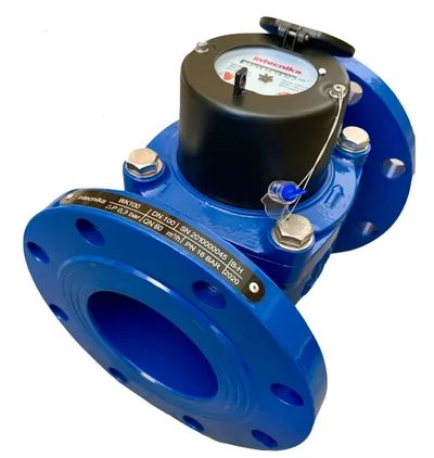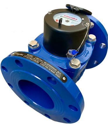 Medidor tipo turbina hélice woltman para agua potable fría caratula Cobre-Vidrio Protección IP68 temperatura máxima de operación 40º C. Extremos bridados ANSI 150, predispuesto para lectura remota.